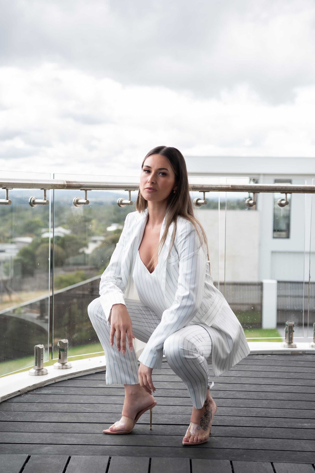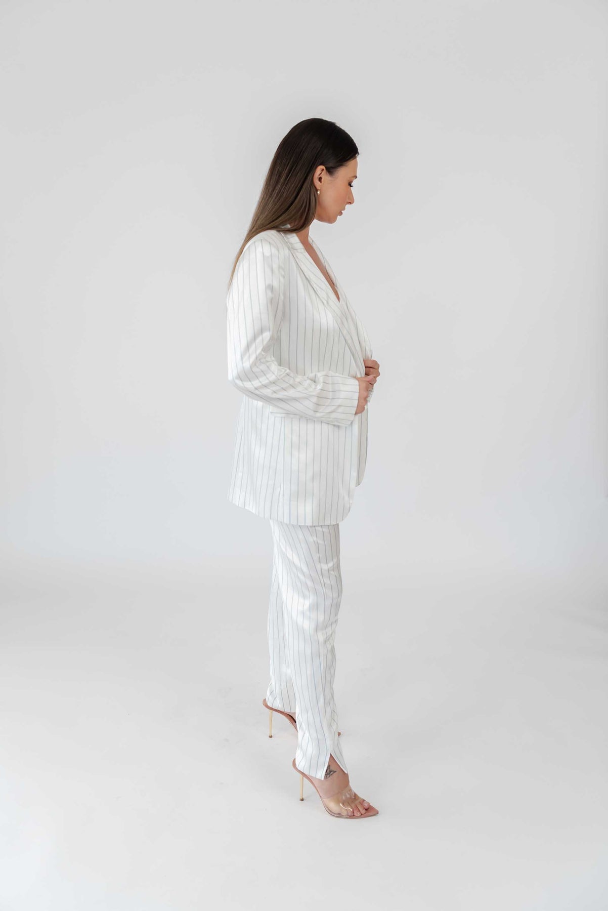 Get ready to turn heads and make a statement with the White Story Silk Stripe Set. This luxurious and sophisticated ensemble, designed by the renowned brand White Story, includes the James Silk Stripe Blazer, Charlie Silk Stripe Pants, and the Sisi Cami top. The light blue stripe pattern adds a touch of glamour, making it perfect for any exclusive event.