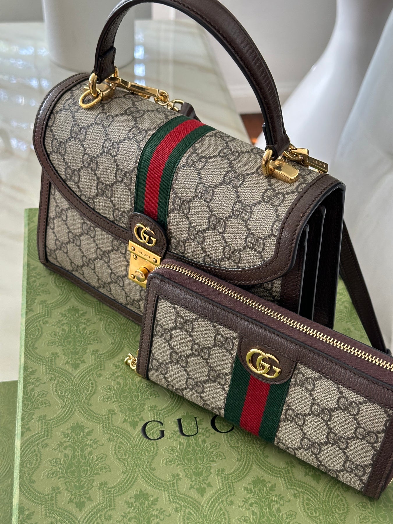 This stunning Ophidia top handle bag from Gucci’s Epilogue collection is the perfect blend of vintage elegance and contemporary style, making it a must-have accessory for any occasion. Its versatile design includes a detachable shoulder strap, offering both functionality and flair. The bag’s square silhouette is highlighted by the iconic House Web stripe and Double G hardware, inspired by a ’70s archival belt buckle, while the signature monogram canvas ensures a strong, logo-driven appeal. Ideal for anyone looking to elevate their wardrobe with a piece that effortlessly combines sophistication and a touch of Gucci’s rich history. Perfect for your next event or daily wear!